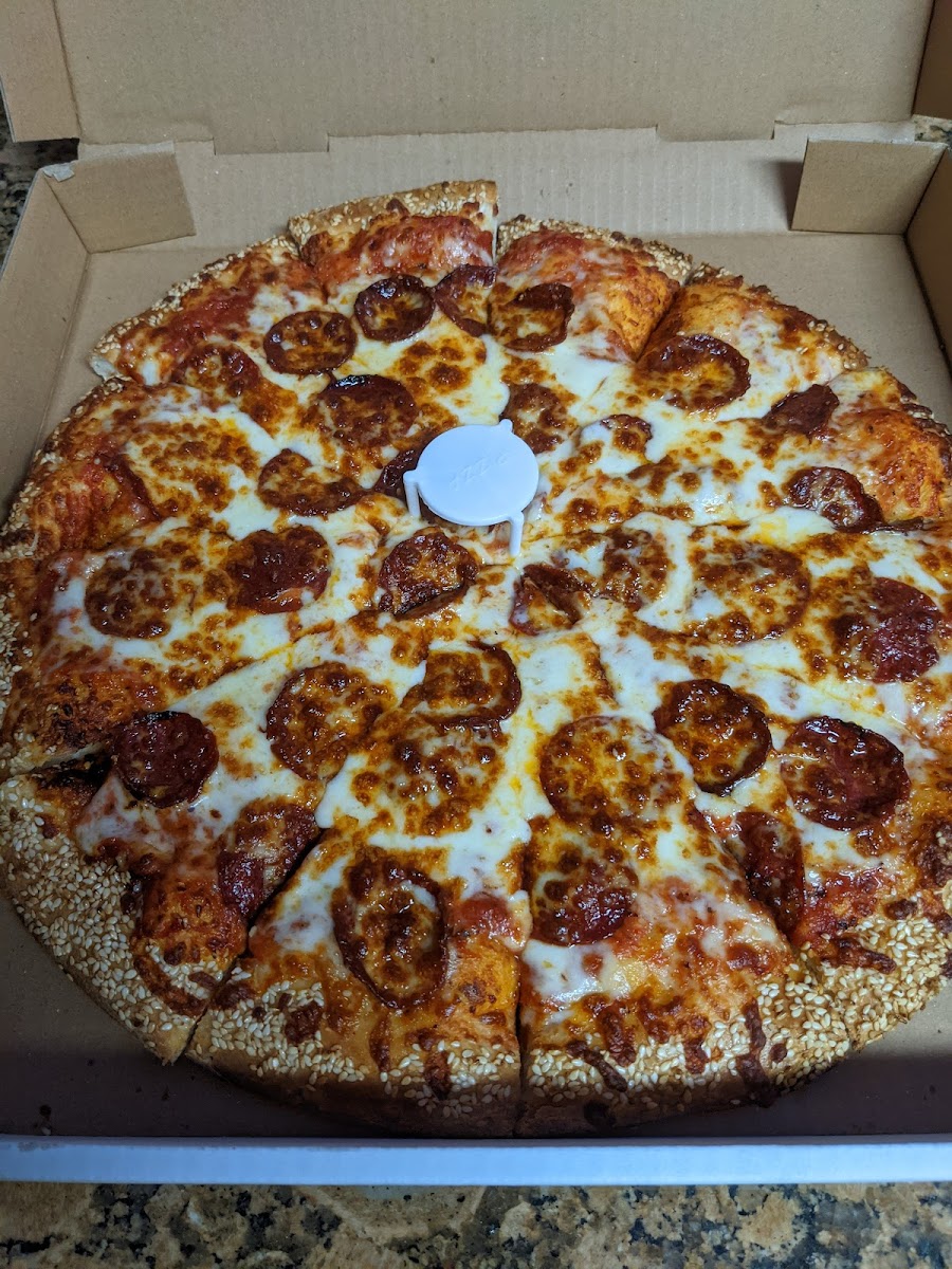 I have been getting pizza here for over thirty years, That's the better part of my life and I have always been a fan of the sesame crest.And quality ingredients they use. I remember coming here in high school with fellow football players and splitting a party pizza between 4 or 5 of us and not being able to finish it. 's, it's probably. 7 to 8 pounds and as big as a large truck tire. they also have a special large one-topping pizza for $12.99, $14.18 with tax. That is an unbelievable deal these days!!!!